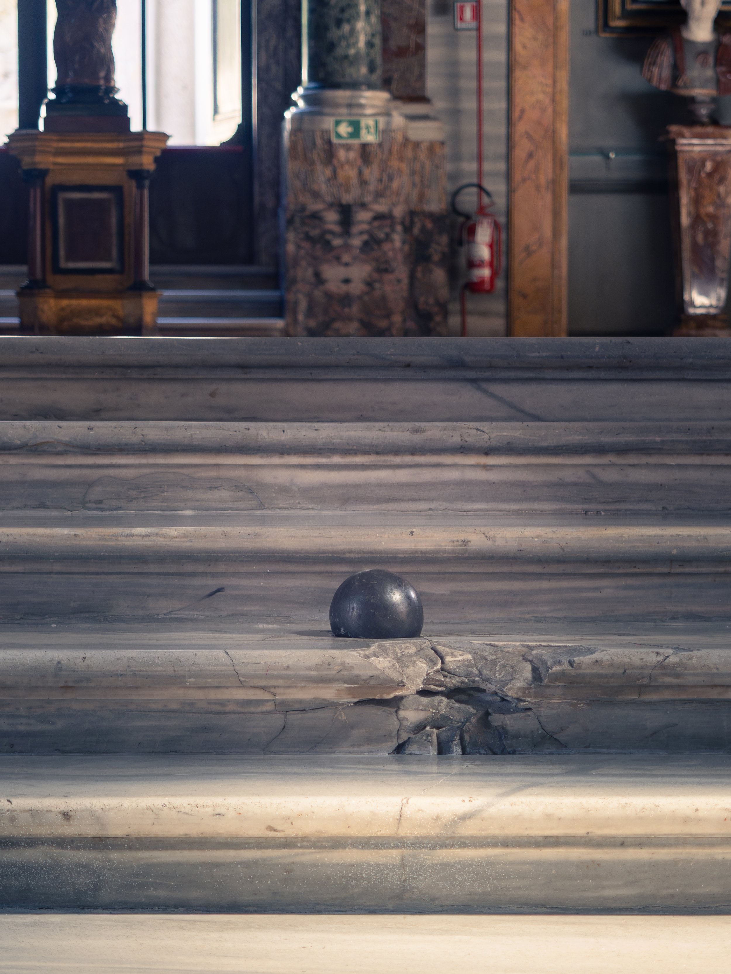 A single black sphere rests on the short flight of stairs connecting the Great Hall to the Room of the Column. This object is a solid iron cannonball fired by the French army during the siege of Rome in 1849.