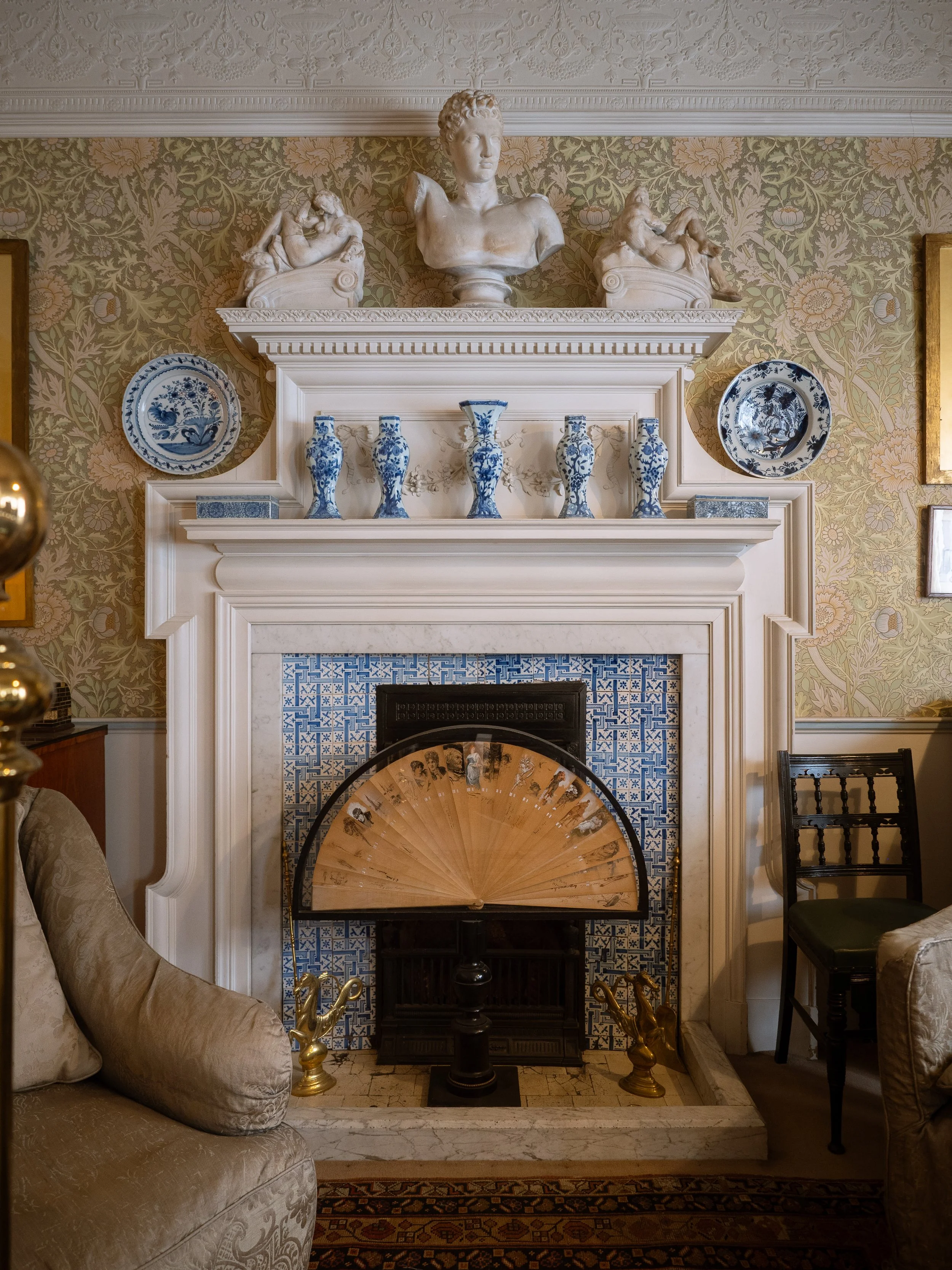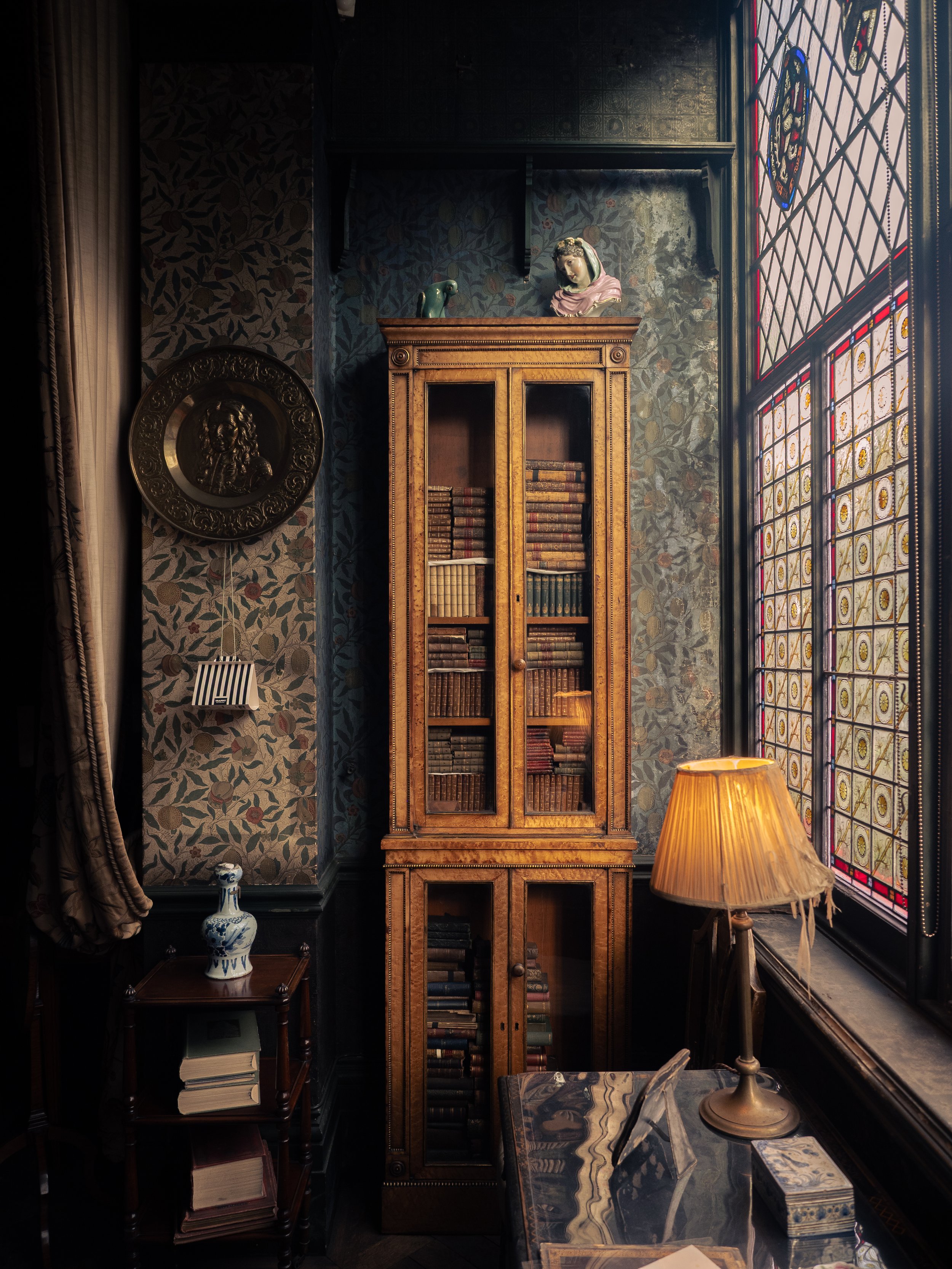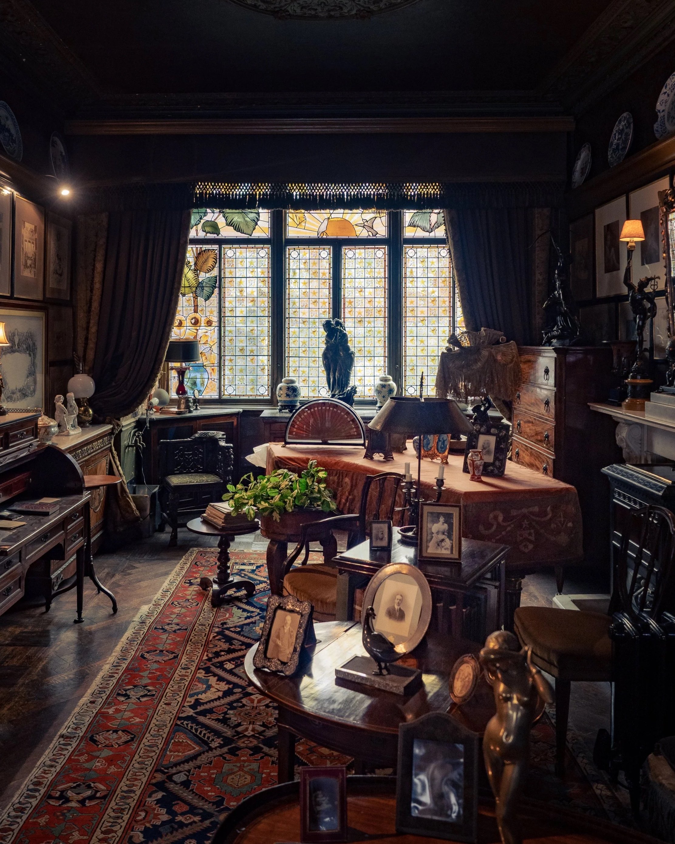 The result is a visual overload that somehow works perfectly. The walls are covered in William Morris papers (specifically the "Pomegranate" and "Larkspur" patterns). There is blue and white Chinese porcelain on the shelves, Japanese prints on the walls, and stained glass on the windows.