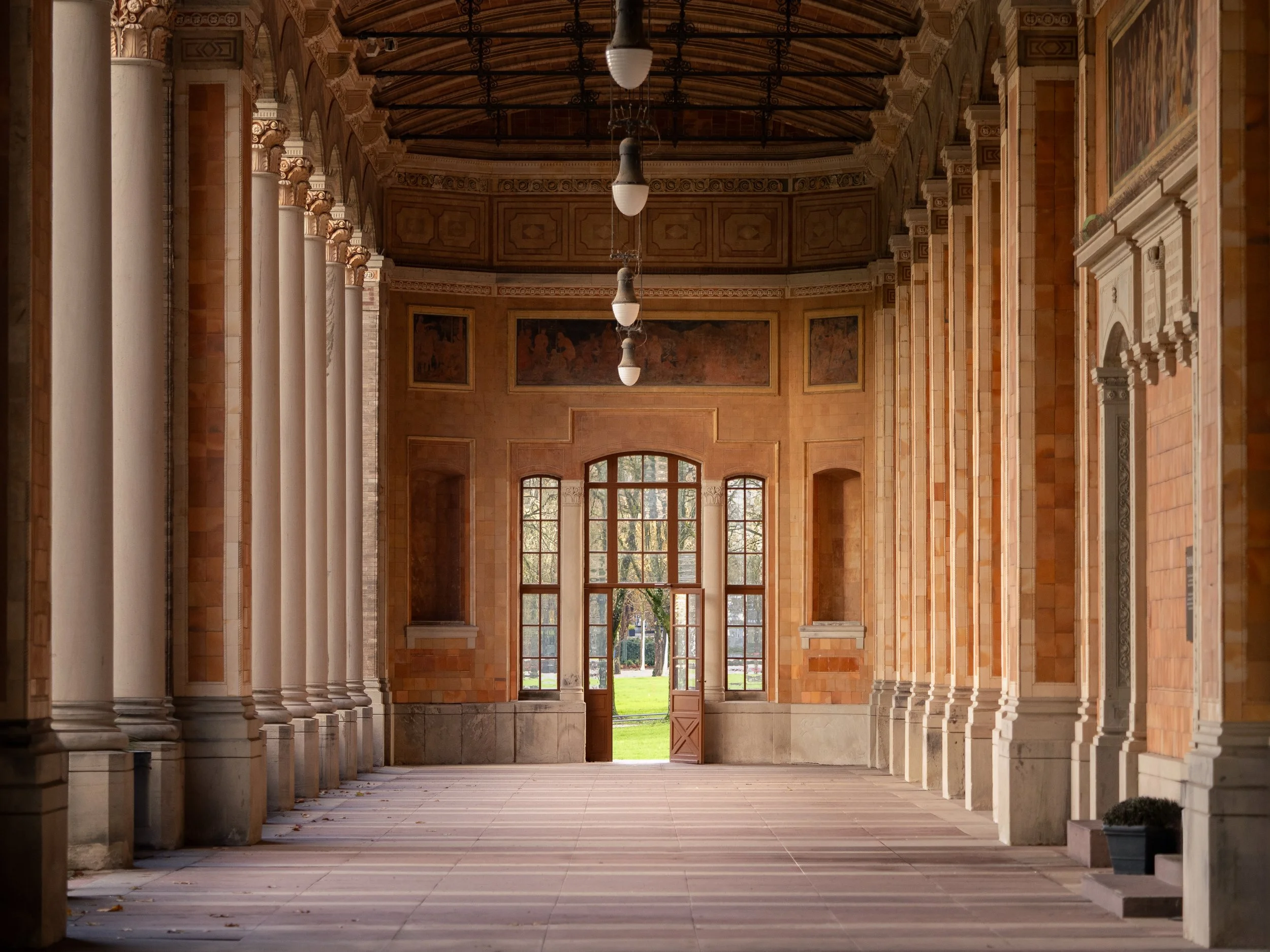 You cannot miss the Trinkhalle because it is a massive 90 meter long porch right in the center of town. It was built between 1839 and 1842 by the architect Heinrich Hübsch. The main reason to walk the length of the portico is to see the fourteen frescoes by Jakob Götzenberger which were finished in 1845. They tell local legends like the ghost of the castle or the fairy of the lake. Inside you can drink the thermal water from a stone fountain. It is full of salt and minerals and comes out of the ground quite warm. It tastes like lukewarm chicken broth which is an acquired taste to say the least.