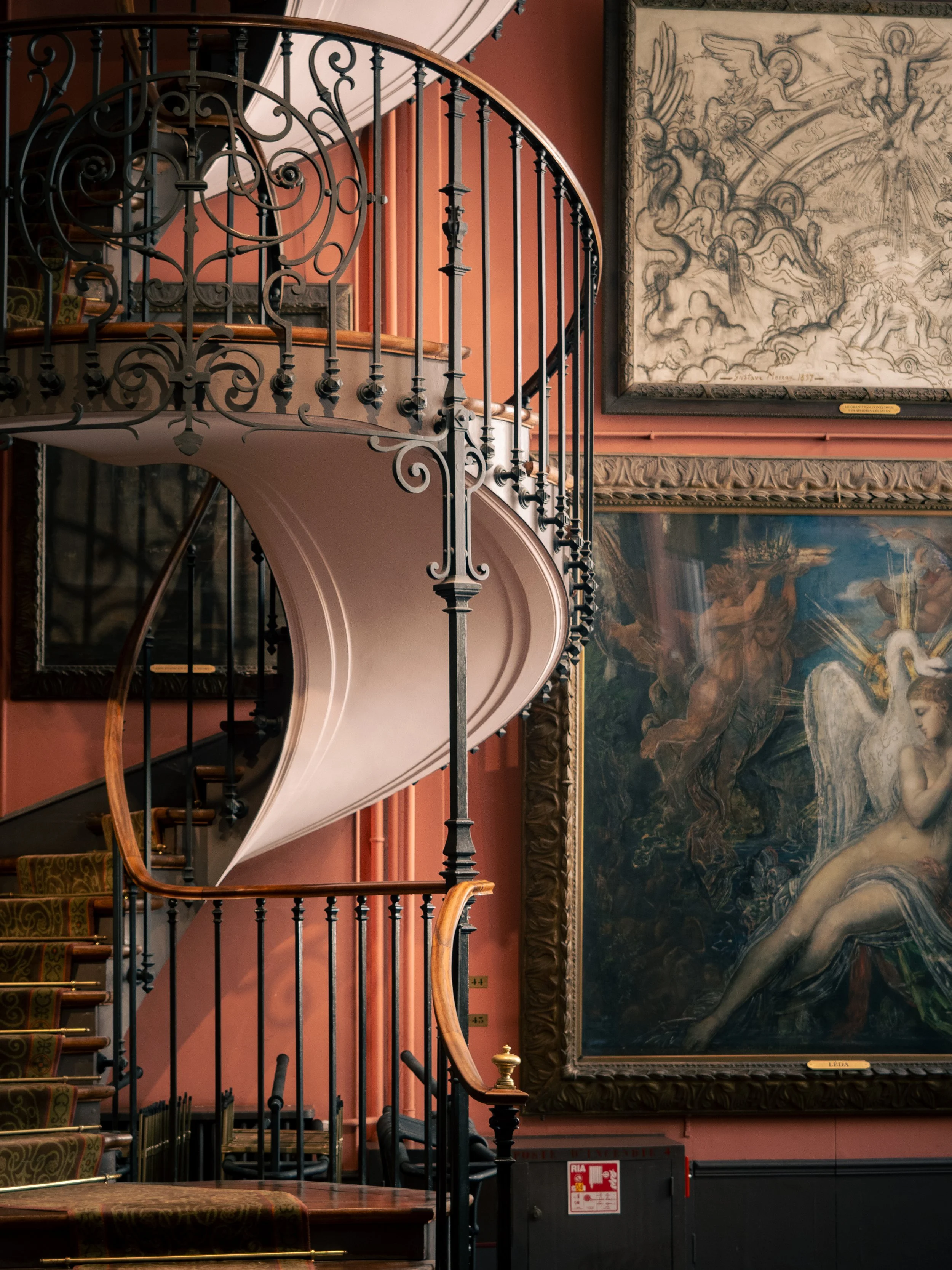 For a house built in the 1850s, dropping a massive iron coil like this into the middle of it was a huge structural risk, but it’s the only thing in the house that feels as modern as Moreau’s paintings.