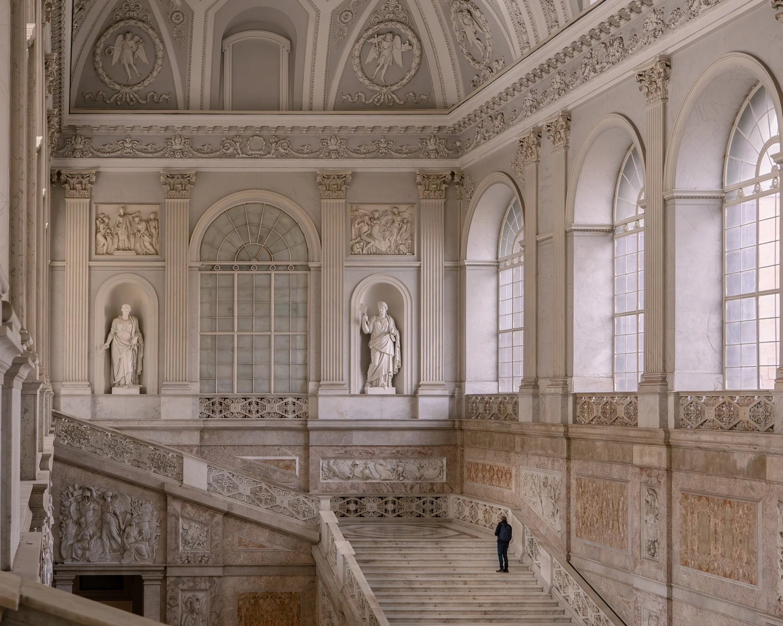 Yet, in a photograph, this immense scale vanishes. The classical proportions are so perfect that scaling up every arch, balustrade, and column tricks the eye into seeing a regular sized staircase. Without a person standing there to break the illusion, it is impossible to tell its true size. This is why I was so kind and left a person in the picture for you all to see!