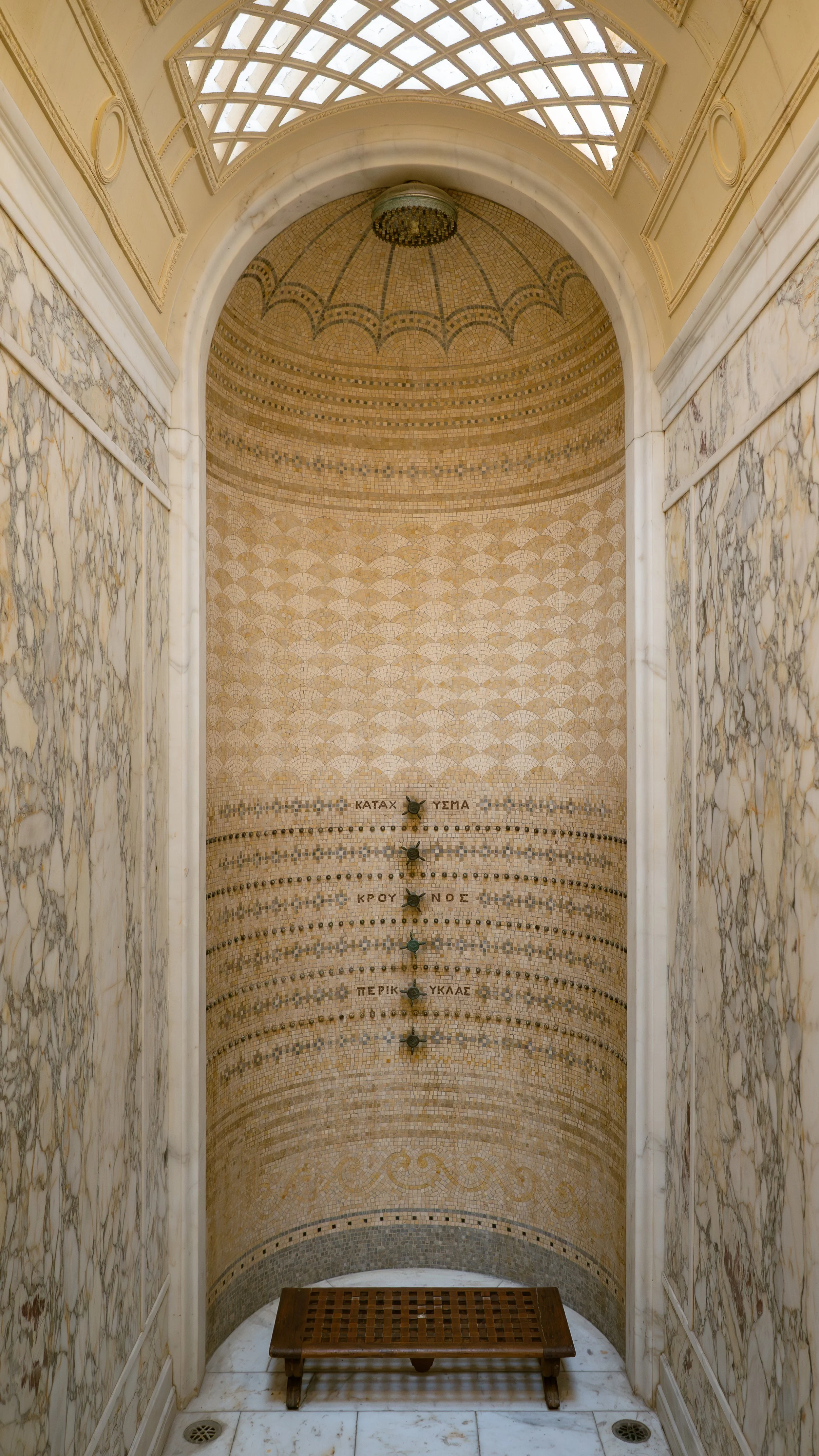 There are no "hot" and "cold" taps here. That would be too pedestrian. Instead, the water controls on the wall are labeled in Ancient Greek (like KATAXYΣMA for the overhead deluge), allowing the bather to select their water flow like a Homeric hero.